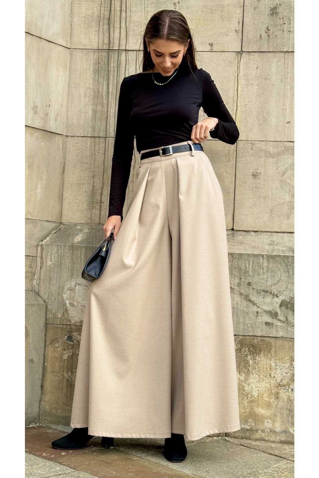 LIGHT BEIGE kalhotová sukně je díky surovině vysoce kvalitním zbožím. Na výrobu těchto kalhot jsme použili ušlechtilou tkaninu - ve složení máme viskózu, polyester a vlnu. Tato neobvyklá tkanina je velmi hustá - bude teplá a zároveň extrémně měkká.
