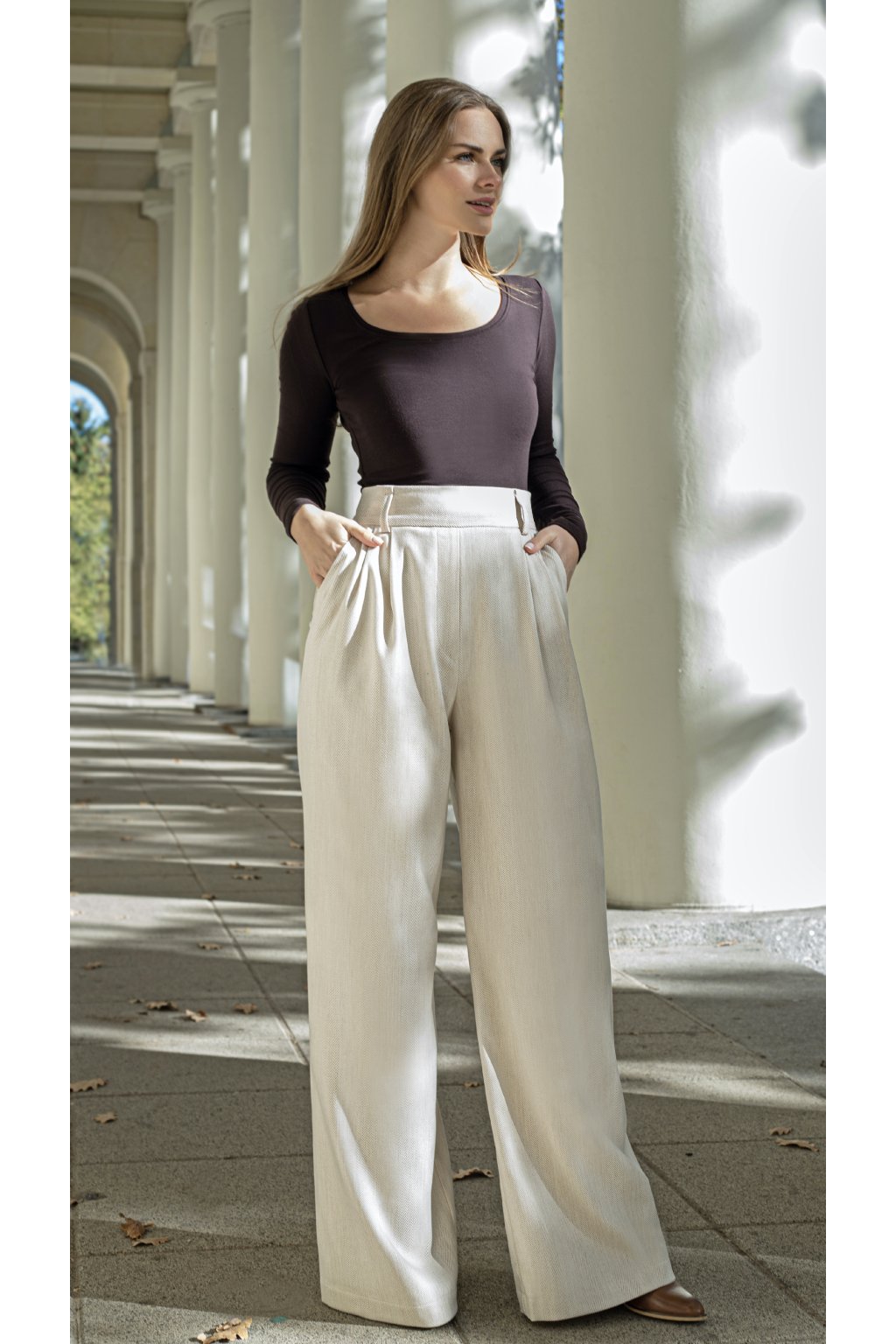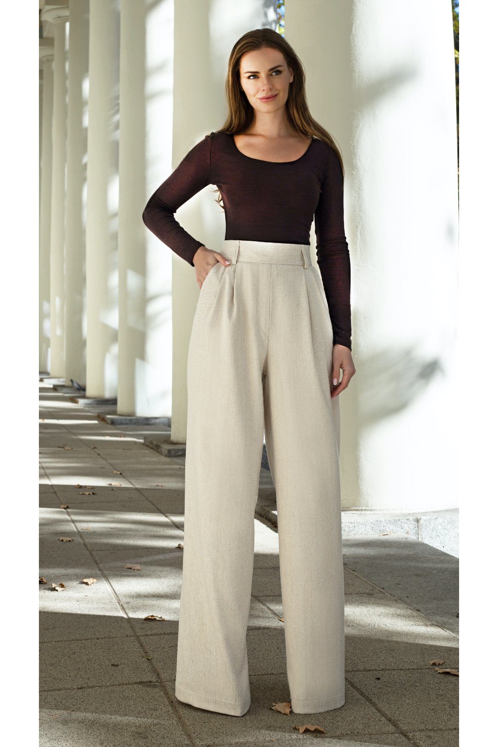 • Kalhoty s vysokým pasem jsou ušity s širším pásem a vsazenou gumou na krátkém zadním úseku, aby se pěkně přizpůsobily postavě.