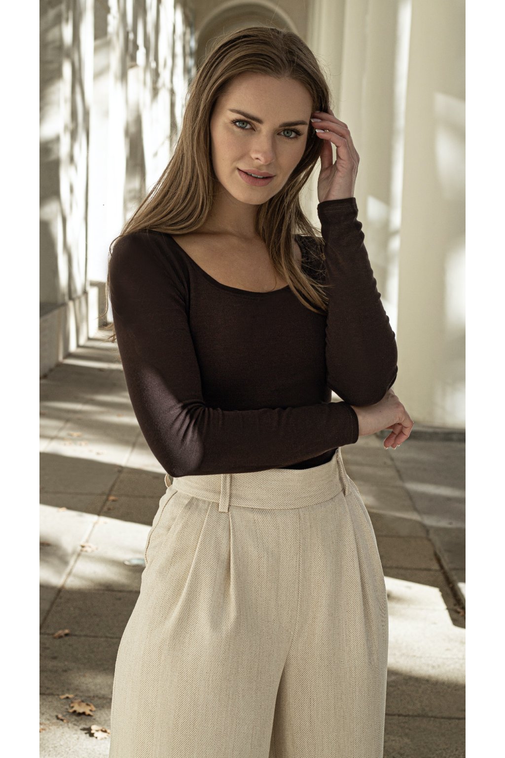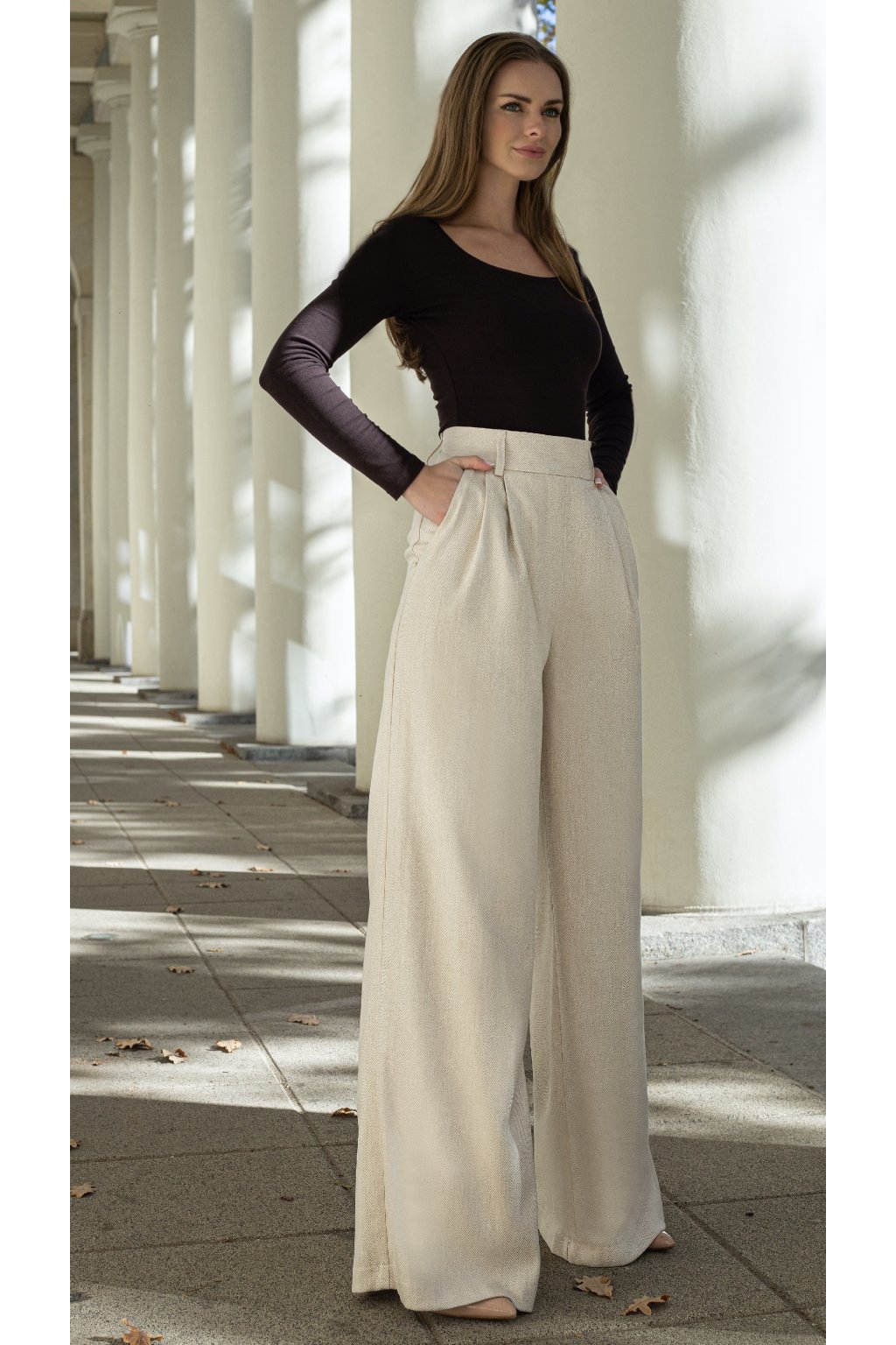 Klasika v tom nejlepším, ženském provedení. Tyto kalhoty byly ušity z měkké, příjemné na dotek látky s elegantním rybím vzorem - ideální pro chladnější dny. Rybí vzor je styl, který je po léta spojován s nadčasovým stylem a sofistikovaností. Charakteristické šikmé linie vytvářejí jemný, rytmický vzor na materiálu, dodávající mu hloubku a ušlechtilý charakter. Přímá, široká nohavice dodává siluetě lehkost a volnost, a dvě záhyby vpředu, orientované ven, jemně modelují linii břicha, opticky ji maskují.