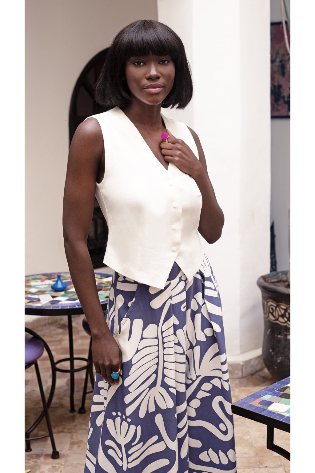 - Naše nabídka je vesta AJSZA s zvýrazněným pasem, která je ideální ke kalhotám, sukním nebo dokonce k šatům.