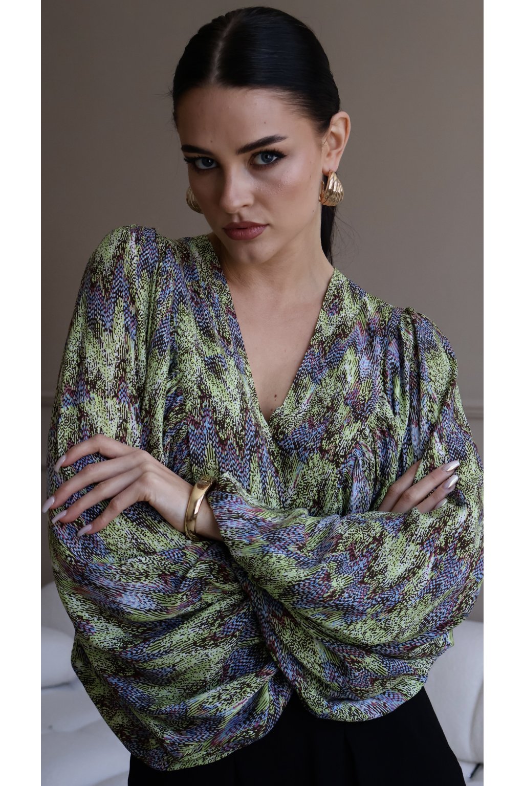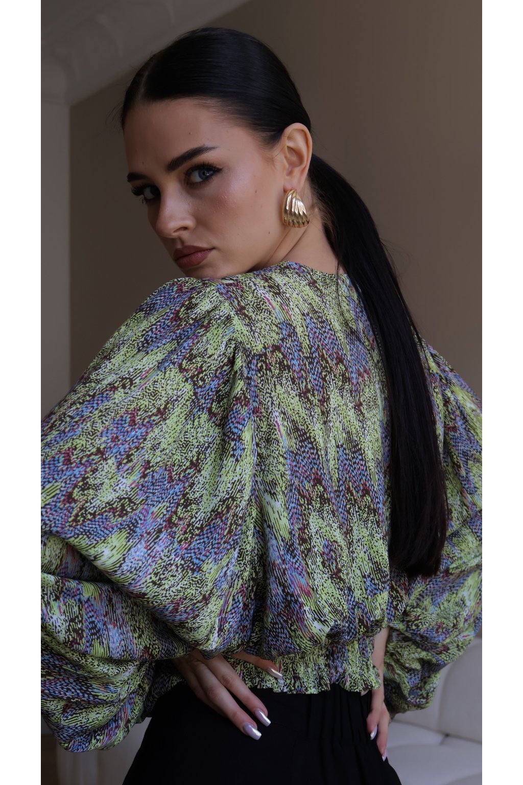 - Široké rukávy jsou ve spodní části elastické a přední část je opatřena všitým výstřihem, který zabraňuje roztahování halenky.