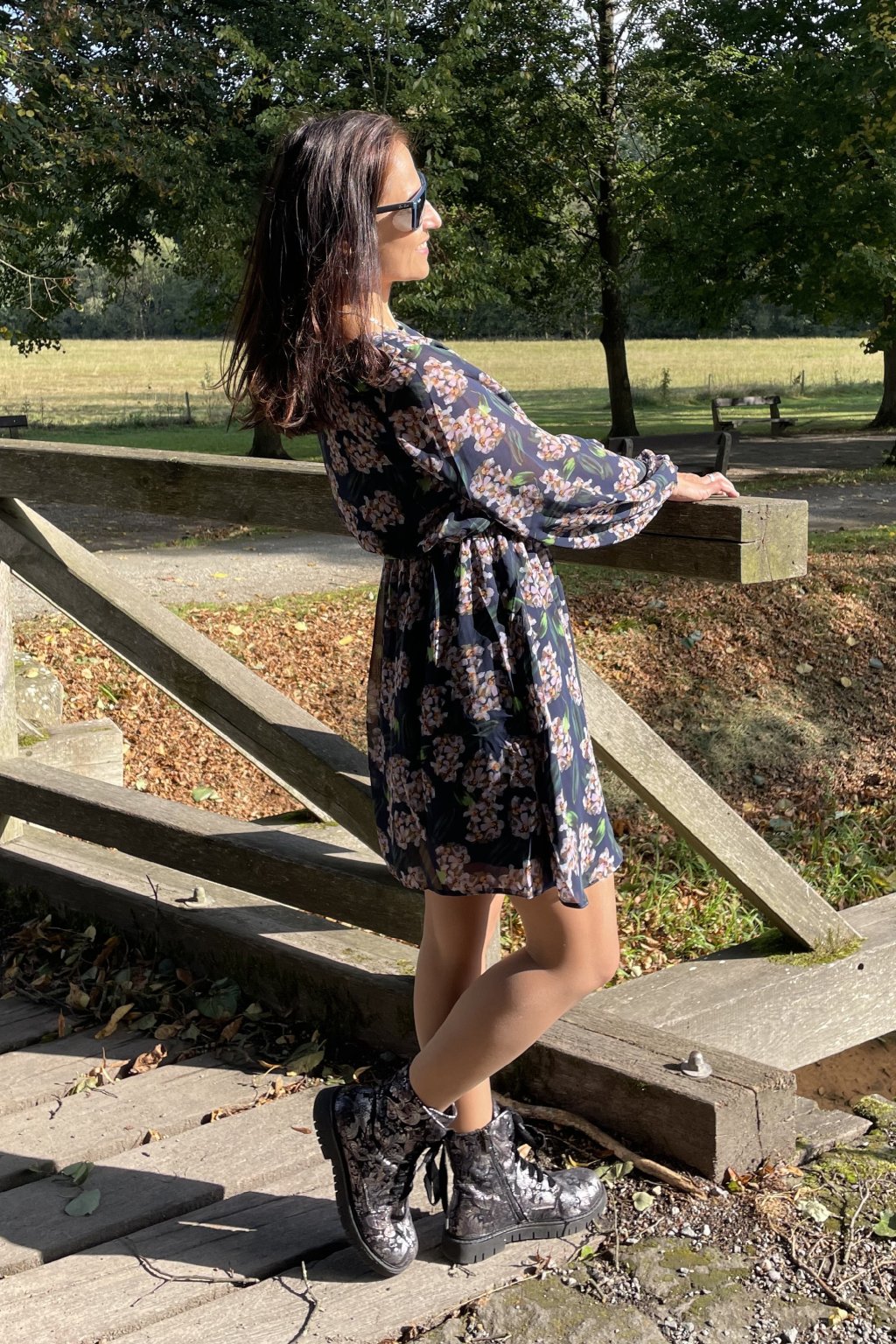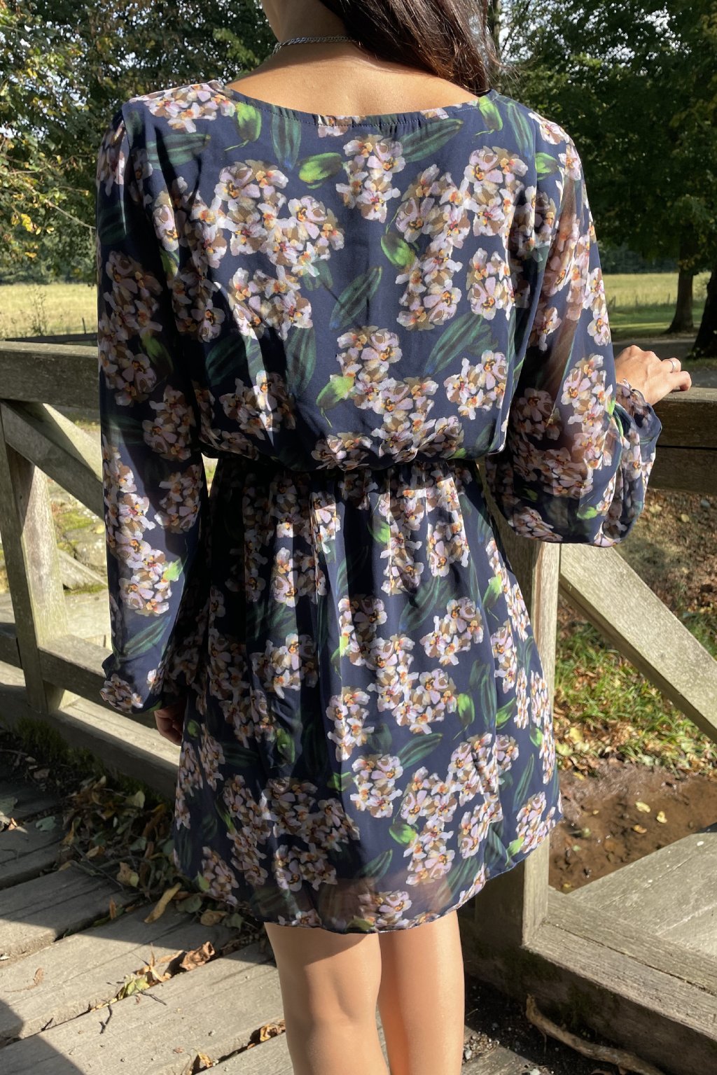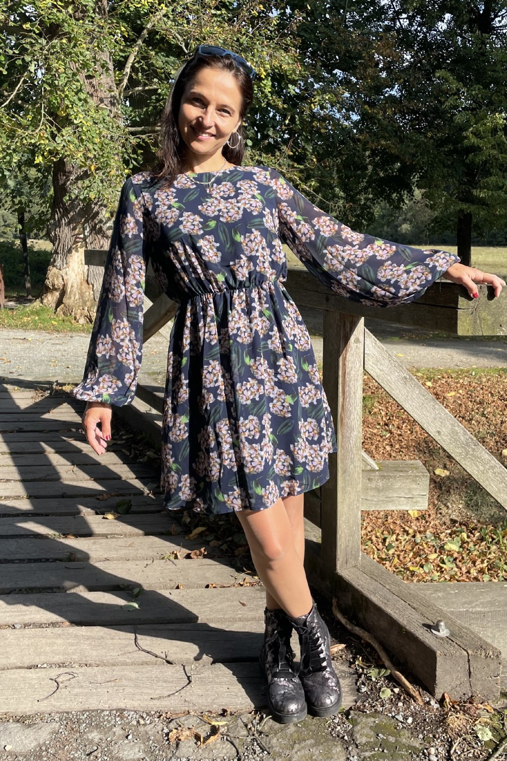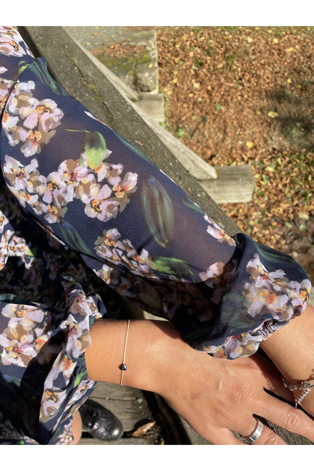 - Půvabný, dívčí model zaujme květinovým potiskem v krásných tlumených barvách na tmavě modrém pozadí.