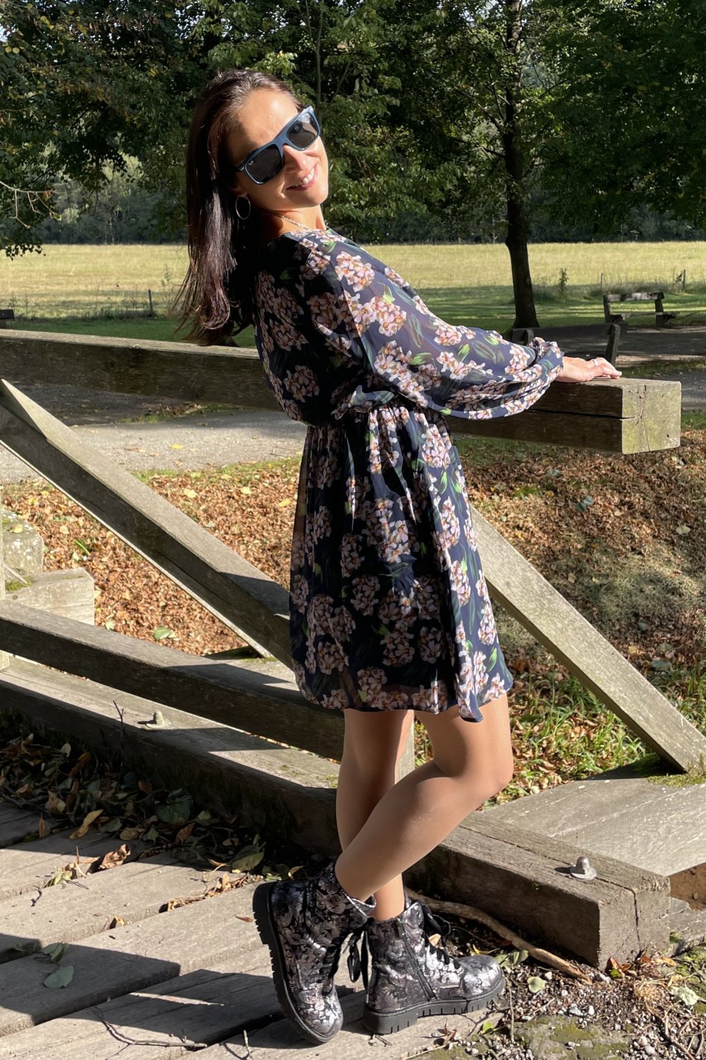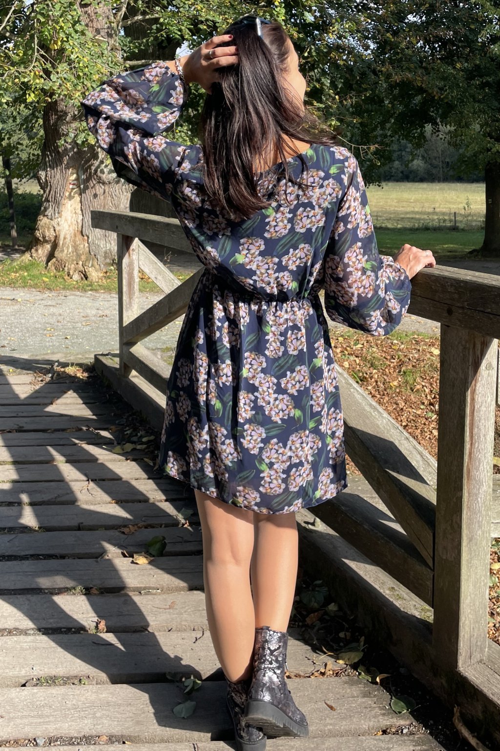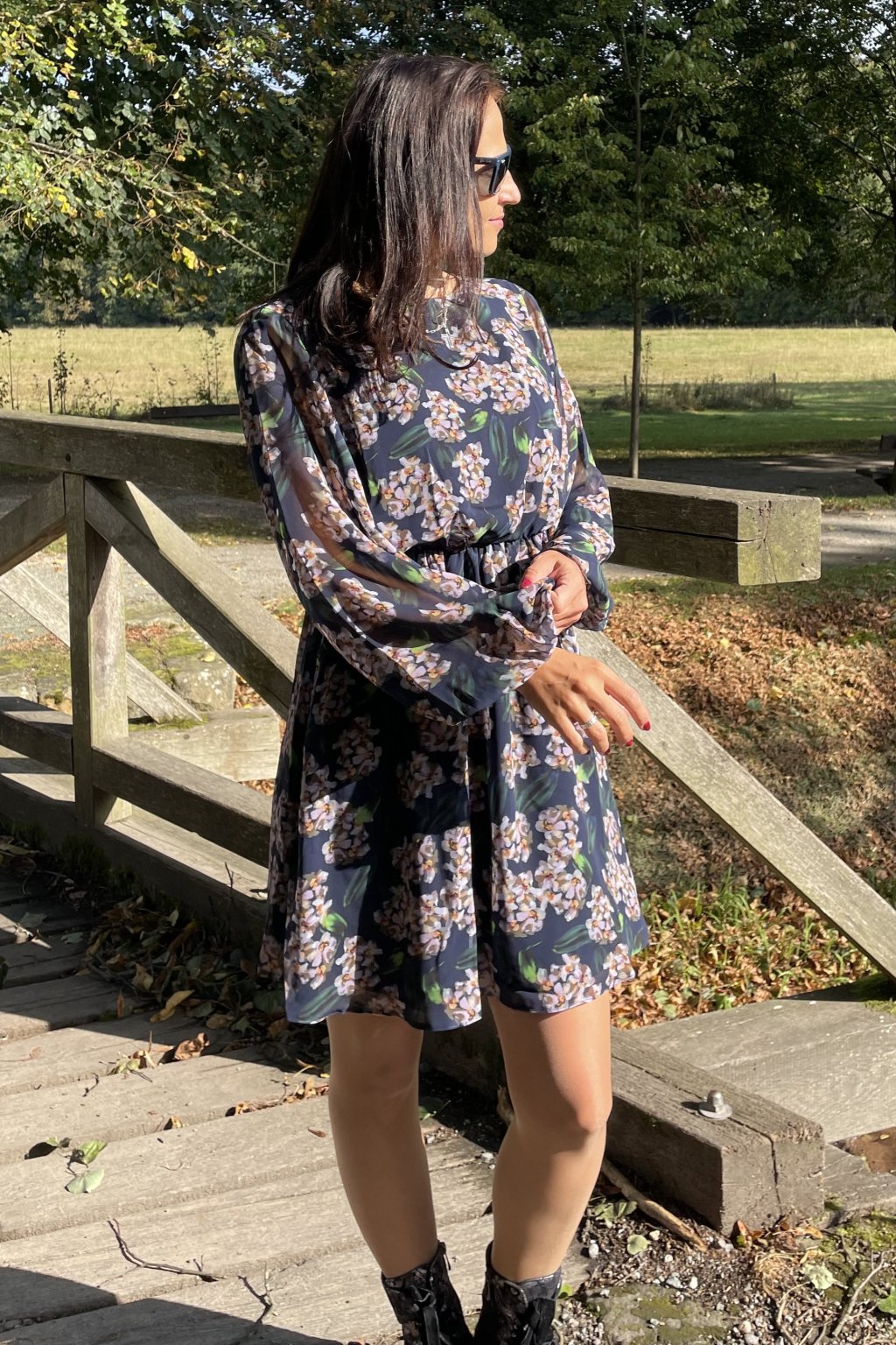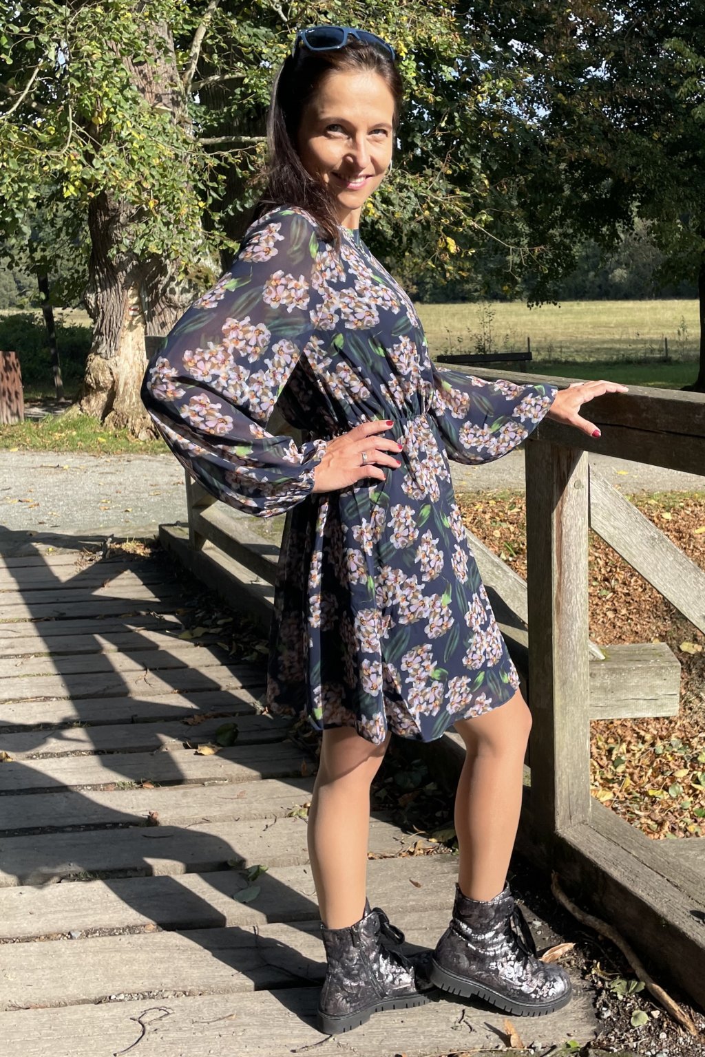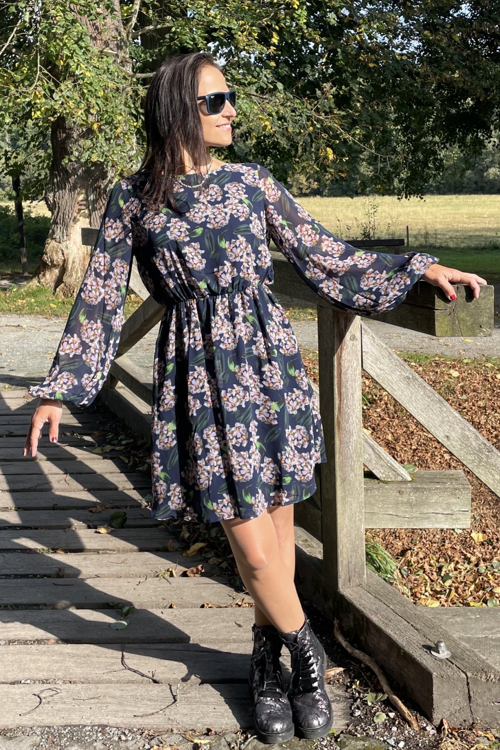 - Půvabný, dívčí model zaujme květinovým potiskem v krásných tlumených barvách na tmavě modrém pozadí.
