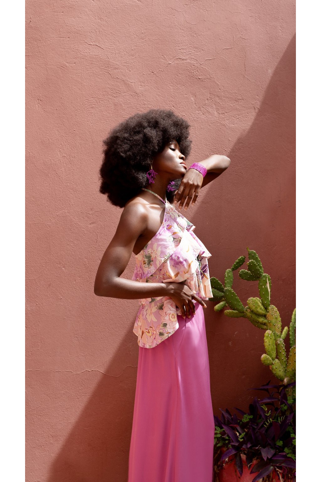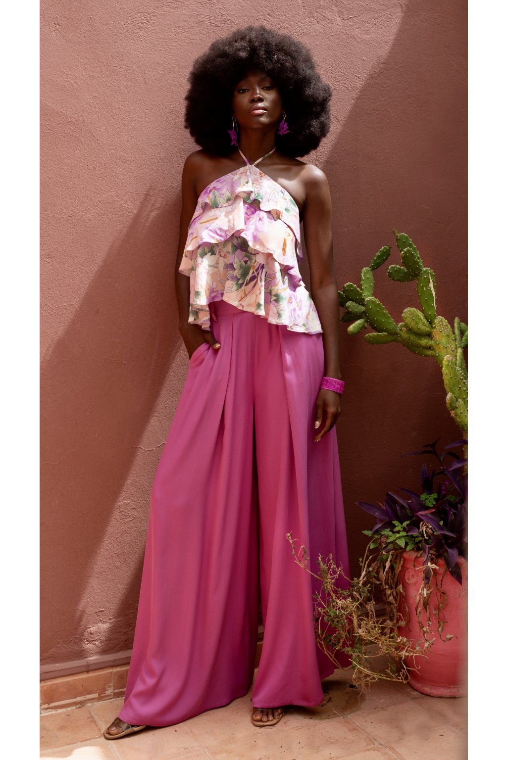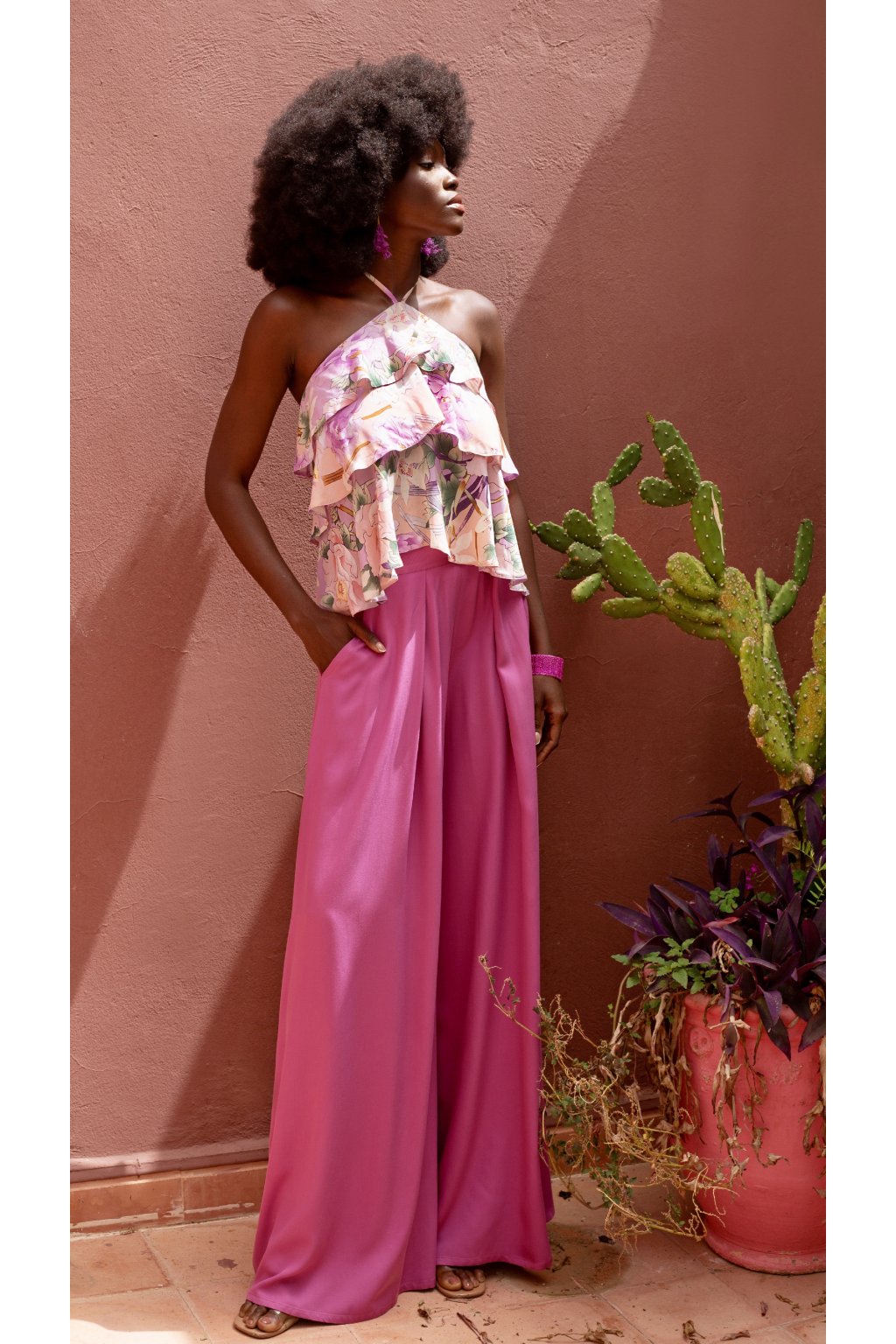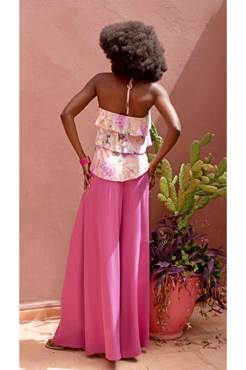 Tento set spojuje splývavé kalhoty s vysokým pasem a lehkou halenku s jemným květinovým vzorem, které spolu tvoří harmonický celek – a přitom skvěle fungují i samostatně.