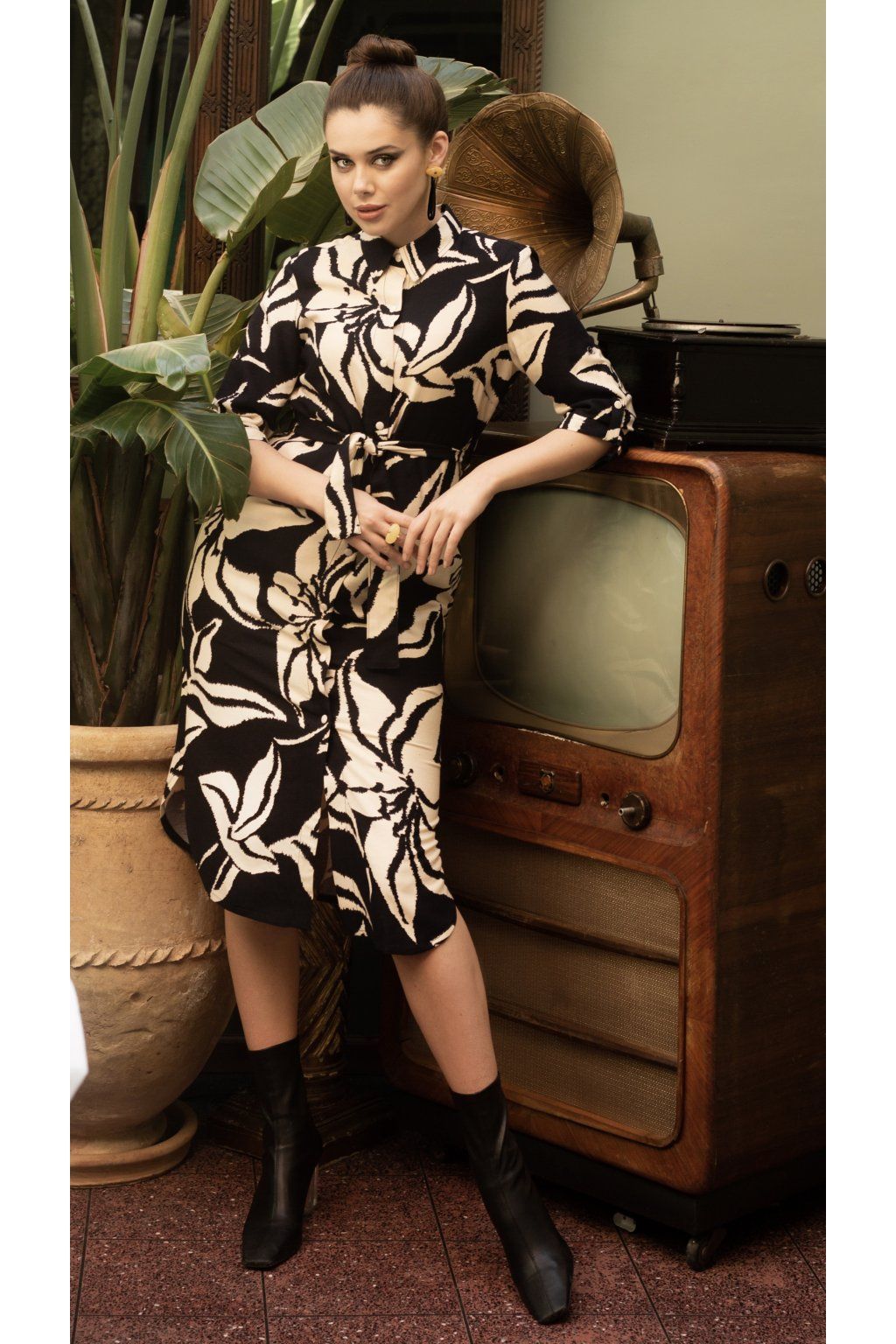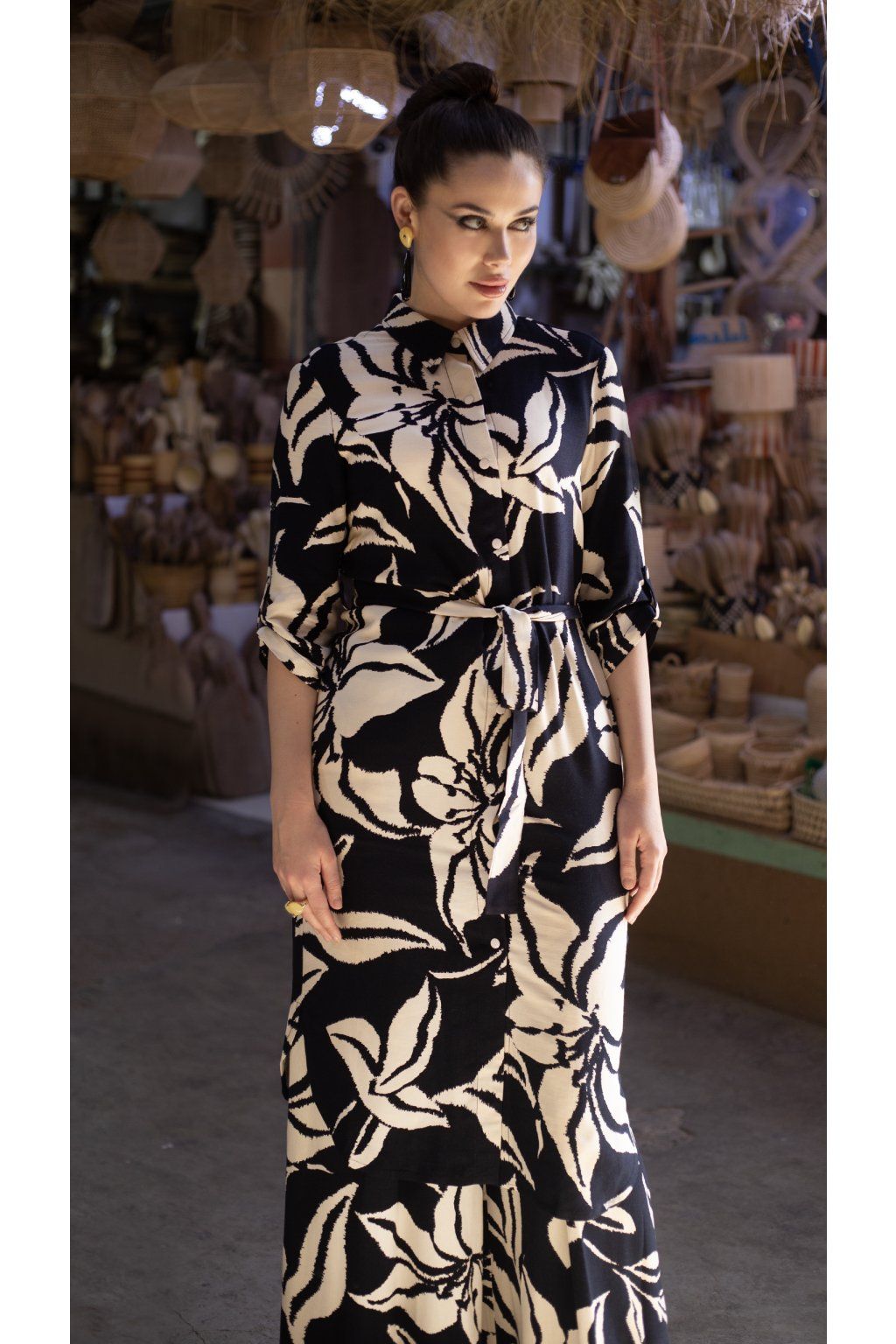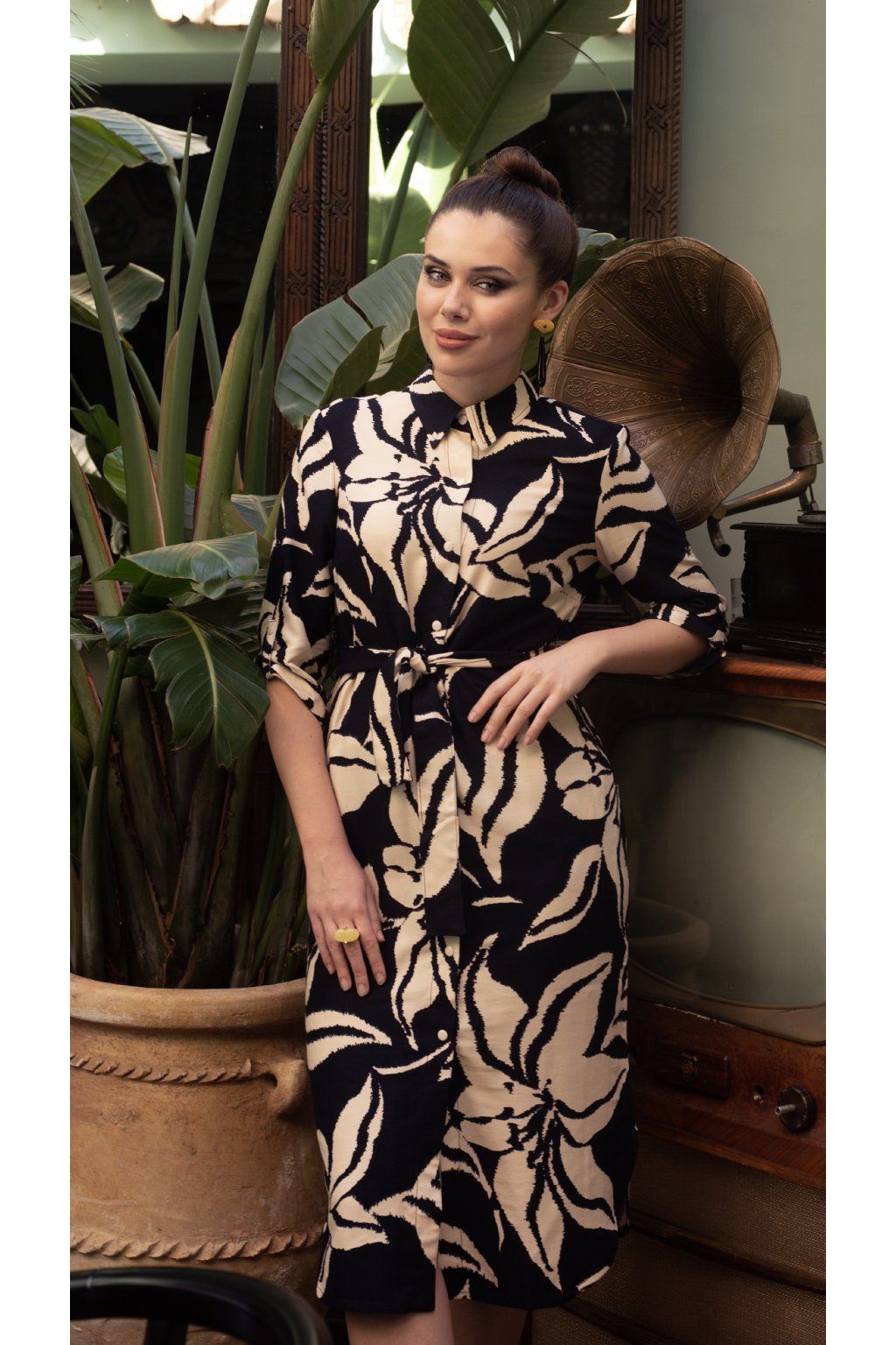 - Košilové šaty pod kolena vyrobené ze 100% viskózy s nádherným květinovým potiskem.